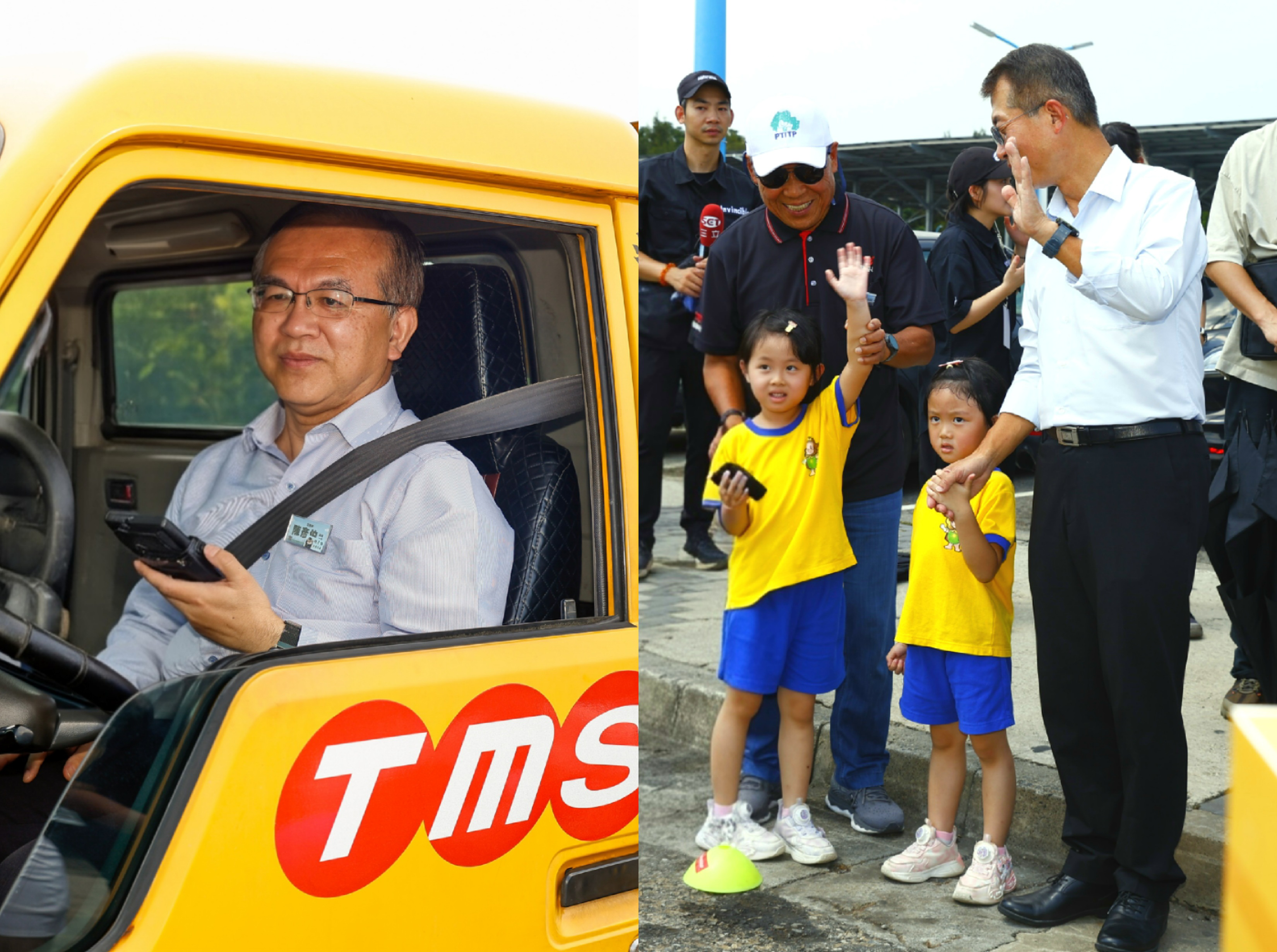 交通部政務次長陳彥伯(圖左駕駛),與高公局局長陳文瑞(圖右白上衣)、遠通總經理張永昌(圖右黑上衣)共同擔任道安宣導大使,和小朋友們一起找出大車視野盲區