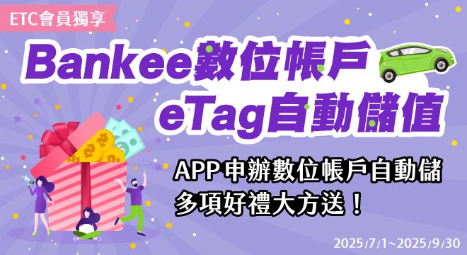 為使ETC App會員享受遠通電收推出便利「eTag用戶儲值服務」,凡申辦Bankee數位存款帳戶,並開啟自動儲值功能,當eTag帳戶餘額足夠支付通行費者,不限新舊戶均享遠通電收提供9折通行優惠。