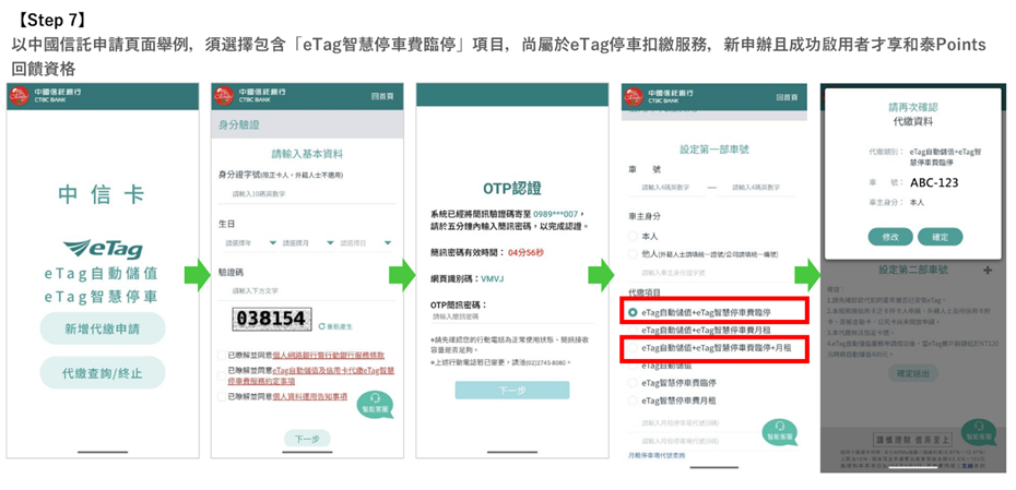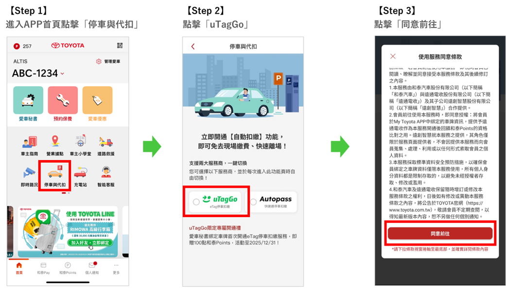 適用對象:和泰集團會員(TOYOTA、LEXUS車主)從「My Toyota App」與「Lexus Plus App」中,前往開通eTag停車扣繳服務的新申辦用戶(限TOYOTA、LEXUS車牌)