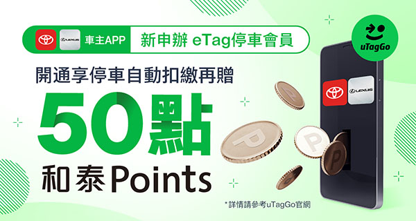 和泰Points 50點:每一車號新申辦並成功啟用eTag停車扣繳服務成功後,將於2026/3/31(二)前自動匯入和泰Points至符合活動條件者所綁定之和泰集團會員帳戶,點數可於HOTAI購商城、原廠保養、精品、及「My Toyota App」與「Lexus Plus App」中之停車、充電等消費折抵使用註1。
